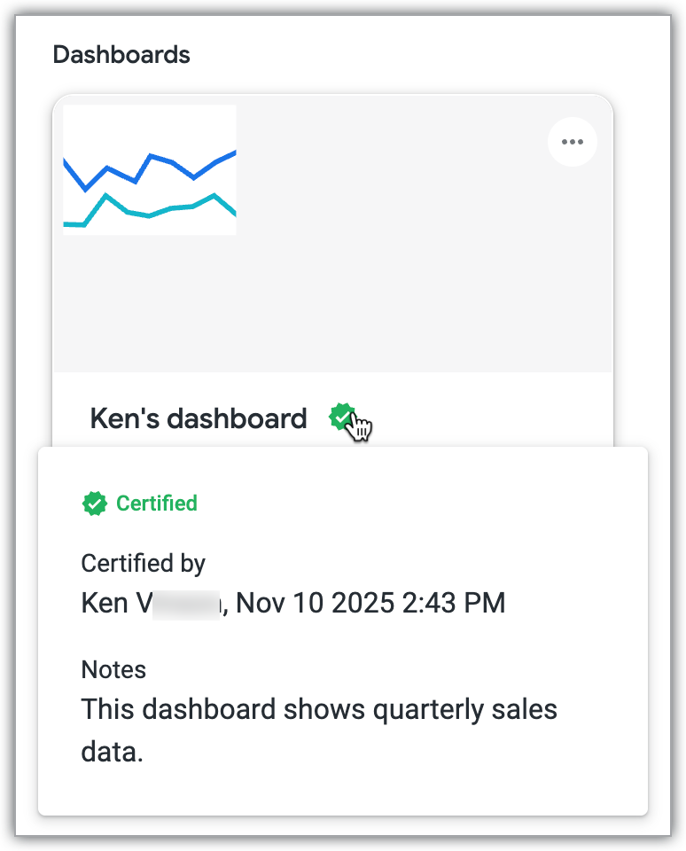 In the details panel for dashboards and Looks, you can view certification metadata, including the certifier's name, the certification date and time, and any notes that were saved by the certifier.