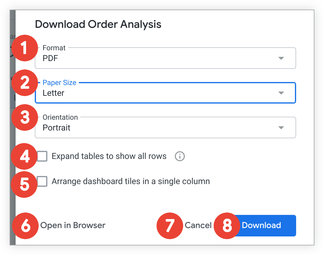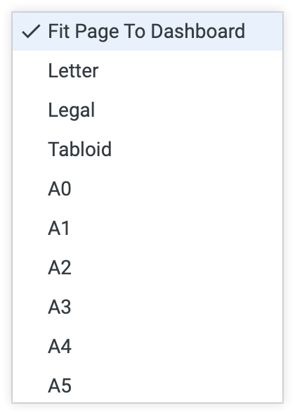 If you select something other than Fit Page to Dashboard in the Paper Size drop-down, an Orientation option appears. You can choose to orient the dashboard in portrait or landscape position.