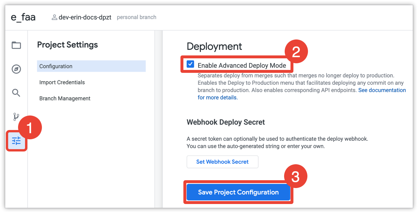 - On the Project Configuration page, select the checkbox next to Enable Advanced Deploy Mode under the Deployment section.