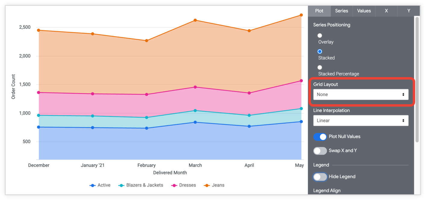 - Overlay: For scatterplot, line, and area charts. Series are overlaid on the chart.