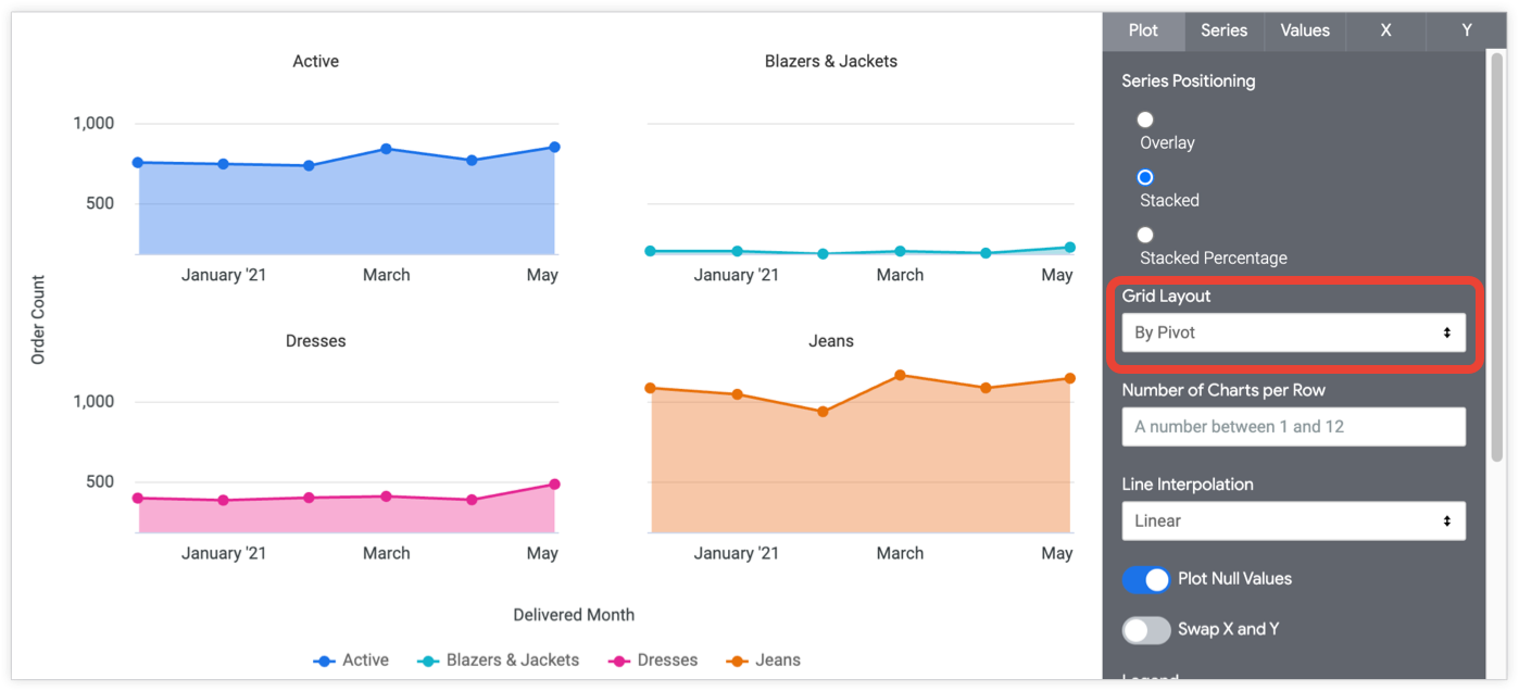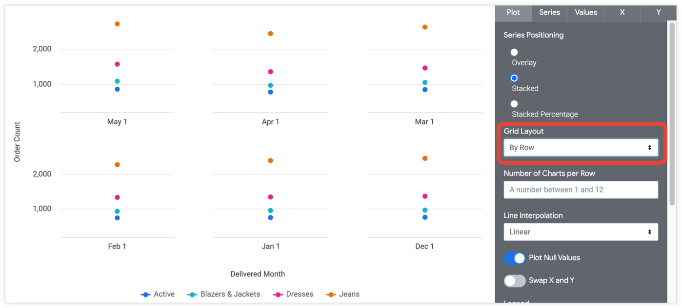 When you select By Pivot or By Row from the drop-down menu, the Number of Charts per Row option appears. You can input a number between 1 and 12. If you do not input a number, Looker arranges the charts as evenly as possible.