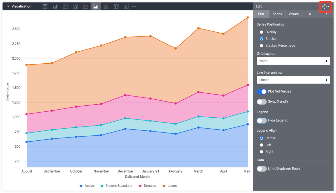 This page describes the options for editing area charts in the visualization menu. To use an area chart, select the Area option from the Explore Visualization bar. Next, select the Edit option on the visualization bar to edit your chart.