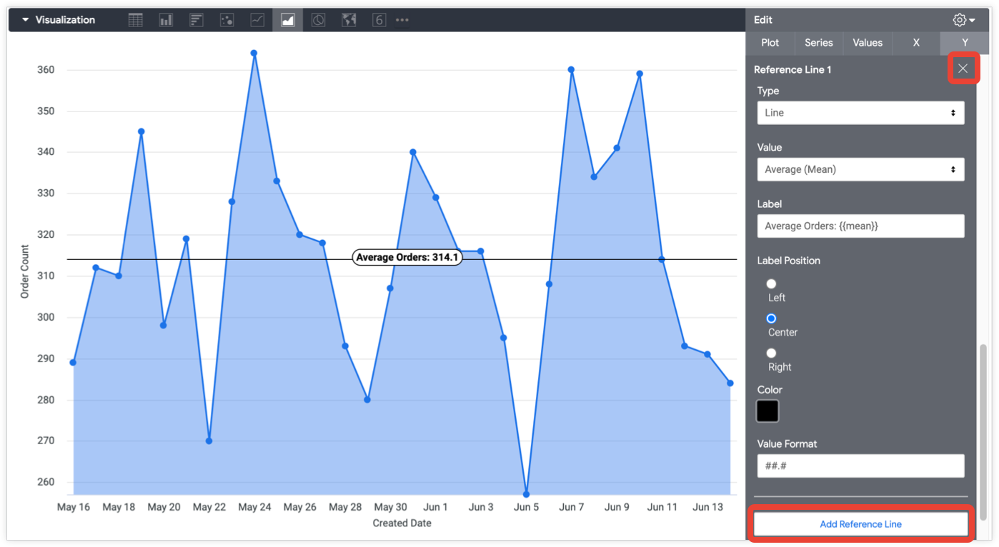 The Add Reference Line button enables the creation of reference lines in a chart. Click it as many times as you like to add any number of reference lines and reveal the settings for those reference lines. To delete a reference line, click the X in the upper right of its settings.