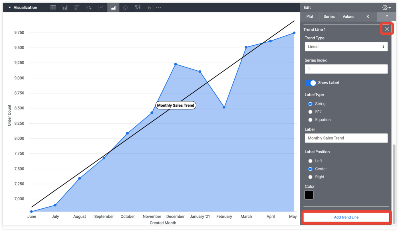y = a * x^bwherebis slope (gradient) andais the y-intercept (the x value where the line crosses the y-axis).Polynomial: A polynomial trend line plots the y-variable as a polynomial function of the given order and x-value. Polynomial trend lines require you to enter the desired order of the polynomial to compute. Looker defaults to an order of 3.