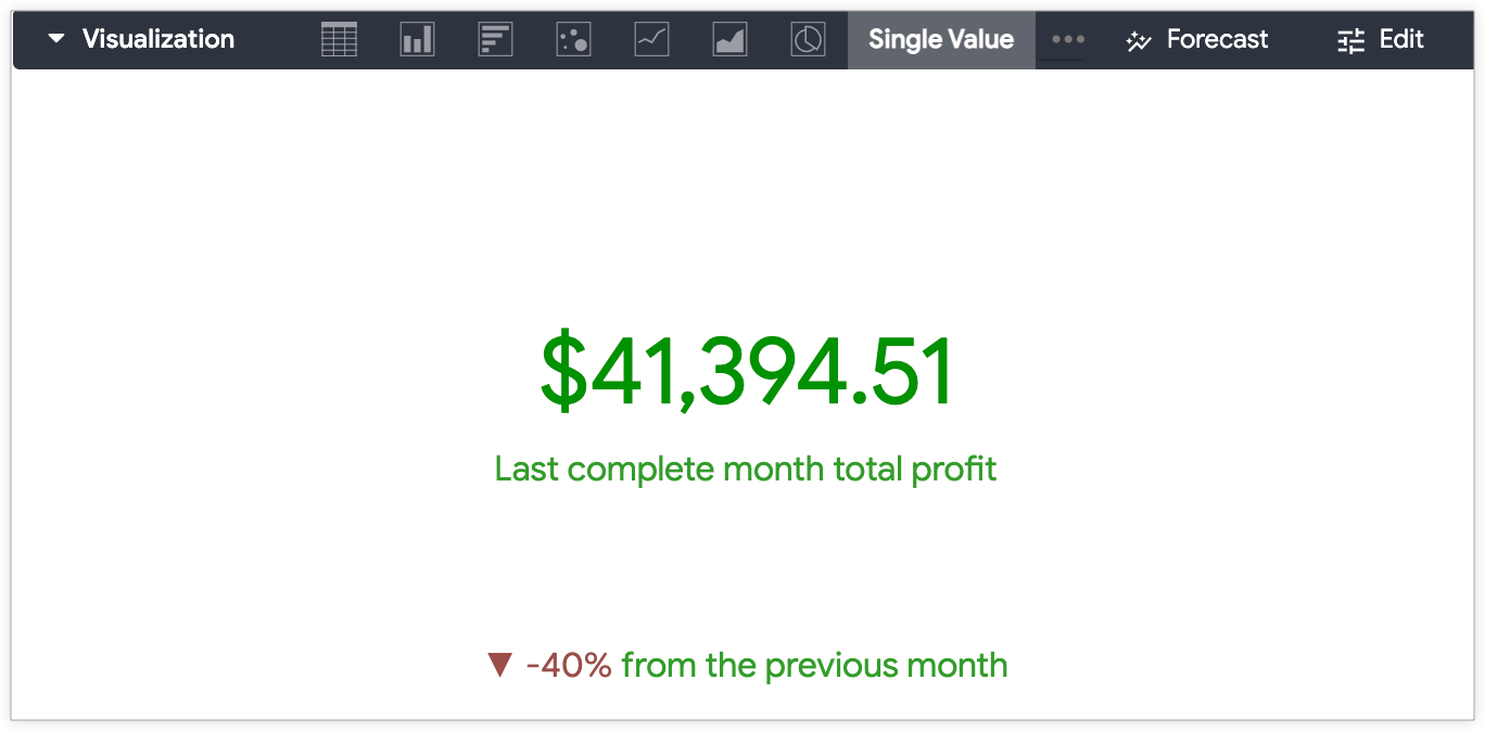 Without the data table for context, the value does not present much information to users. What if you would like to show how the total profit for the last complete month compares with the total profit of the month prior? You can use the settings in the visualization Edit menu to create a comparison of these values in the visualization.