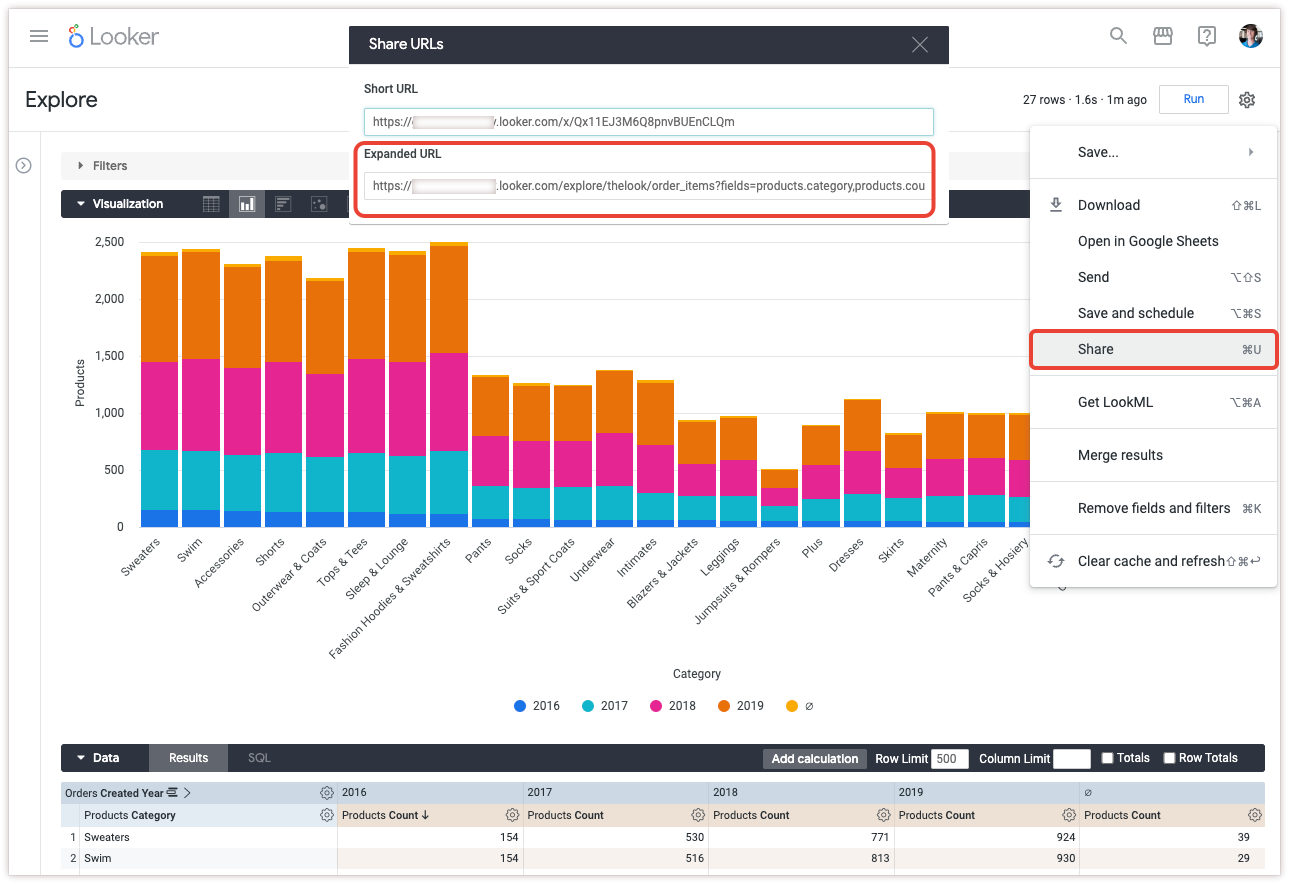If you know that an Explore name or a model name has been changed, you can fix individual Looks and dashboards by using the expanded URL. The expanded URL contains the model name, the Explore name, and the field names. You can take advantage of this function to change the Explore or model name of the query.