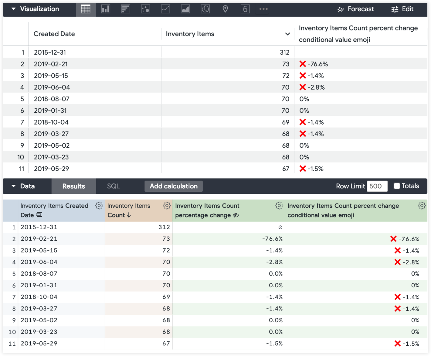 Similarly, the Example 1 conditional formatting pattern can be applied to a percent change table calculation to call attention to rows that may warrant additional attention. The following example has two calculations. This example also uses the Explore with Inventory Items Count grouped by Inventory Items Created Date.