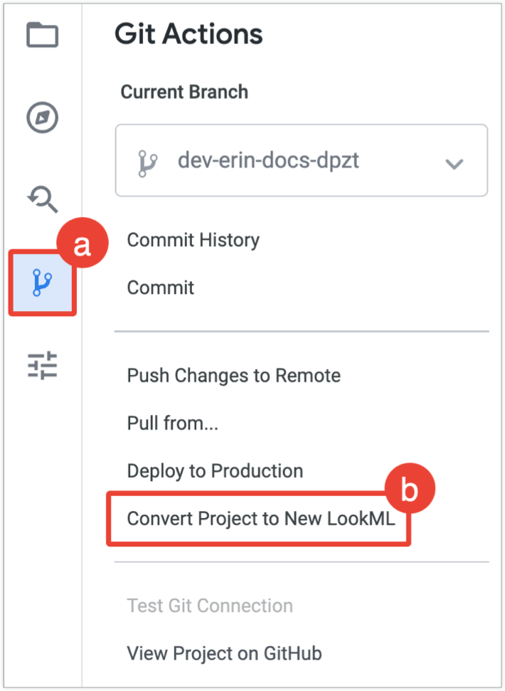 - Select the Convert Project to New LookML option from the Git Actions panel or from the bottom of the Project Health panel.