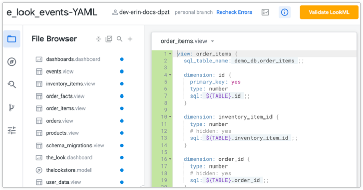- Select the Validate LookML button to run the LookML Validator. If there are no errors, you can skip ahead to the Commit and deploy the new LookML section of this page.