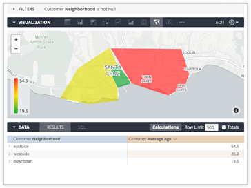 Looker includes several built-in map layers, but you can also define custom map regions to display geographical data. Suppose you have a table of average ages for three neighborhoods, as follows: