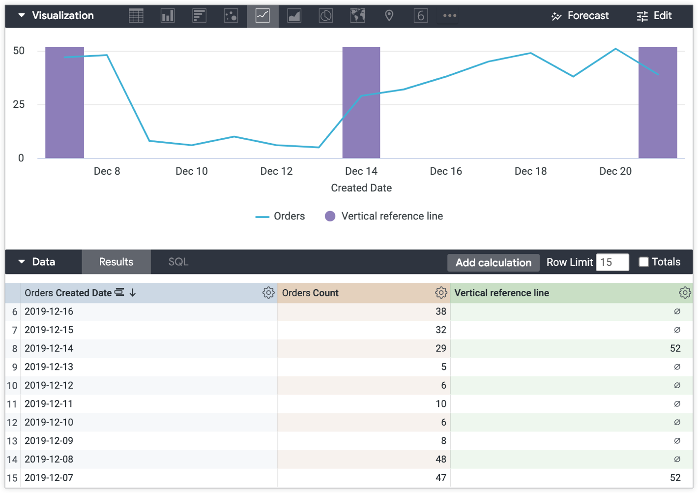 Create a table calculation that references the data points in the visualization that you want to highlight with vertical reference lines. This example of a use case uses the following expression to create vertical reference lines to mark stages in the product launch dates using the Orders Created Date: