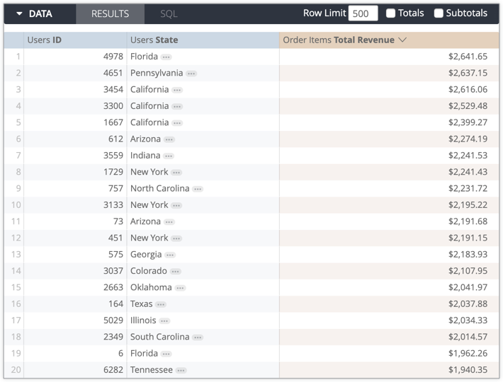 In the example use case, the Explore Data table features Total Revenue grouped by Users State and Users ID: