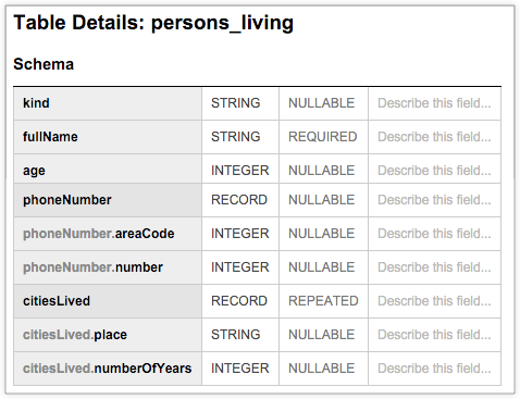 The following BigQuery table, persons_living, displays a typical schema that stores example user data, including fullName, age, phoneNumber, and citiesLived along with the datatype and mode of each column. The schema shows that the values in the citiesLived column are repeated, indicating that some users may have lived in multiple cities: