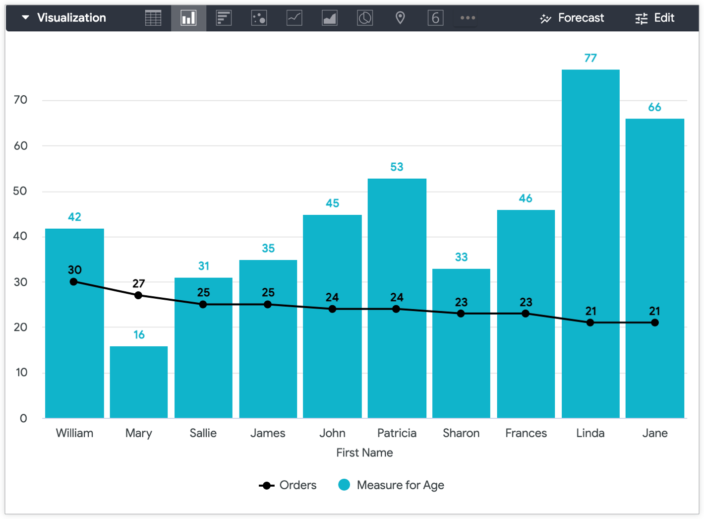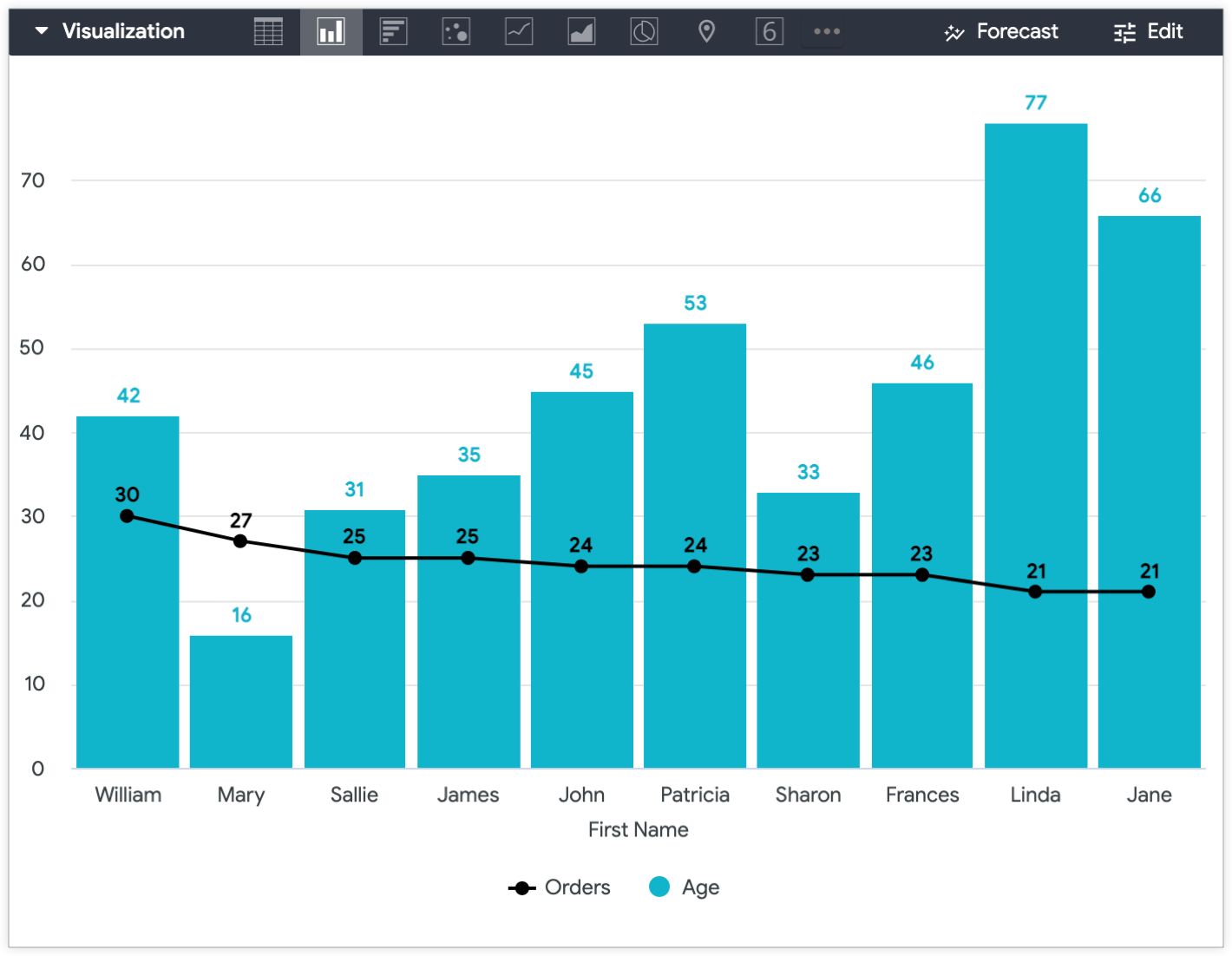 To distinguish between values in a visualization — in this example, the Age measure table calculation and Orders Count measures — you can use multiple vis types in a single chart.