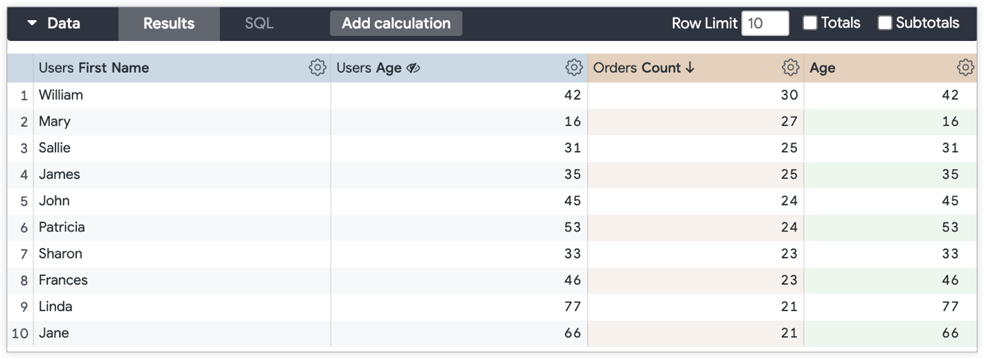 Once you create the measure, include both the dimension and the new measure in the Explore query. For this example, include the dimensions Users First Name and Users Age, and include the measures Orders Count and Users Measure for Age. Finally, hide the dimension that the measure is based on.