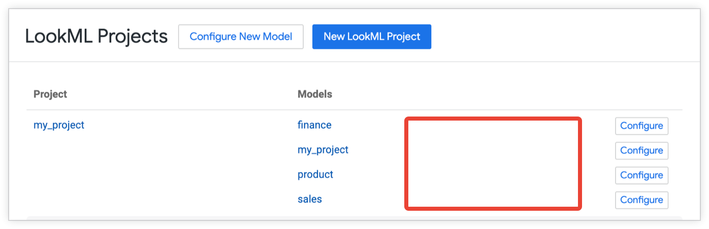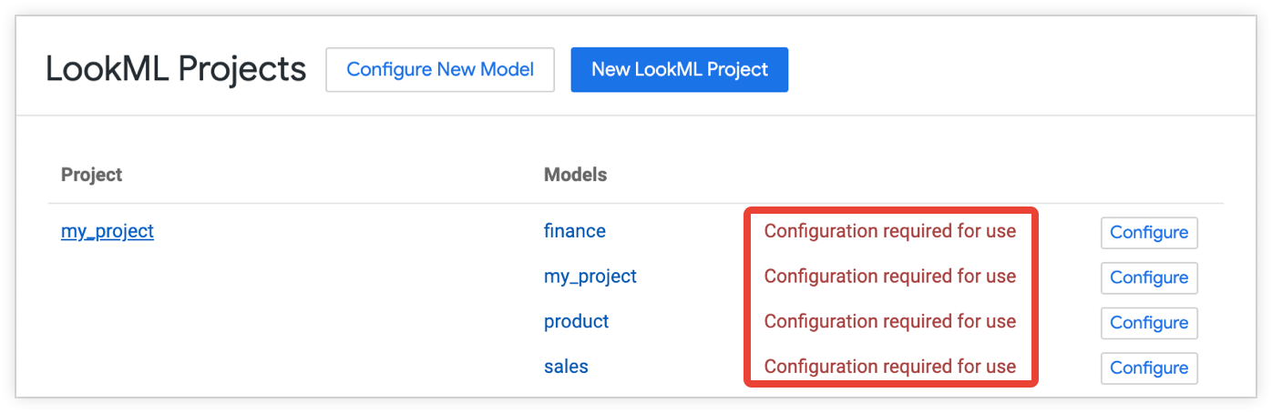 Upon creating a project, you'll be brought to the project's auto-generated LookML model. At this point, you'll need to use the Configure Git button to set up version control for the project. Detailed instructions on setting up version control are on the Setting up and testing a Git connection documentation page.