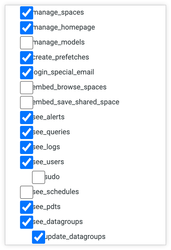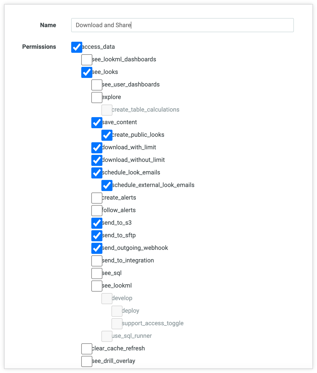 create_prefetches,login_special_email,manage_homepage,manage_spaces,see_alerts,see_datagroups,see_logs,see_pdts,see_queries,see_users, andupdate_datagroupspermissions. - Download and Share: The Download and Share permission set includes the