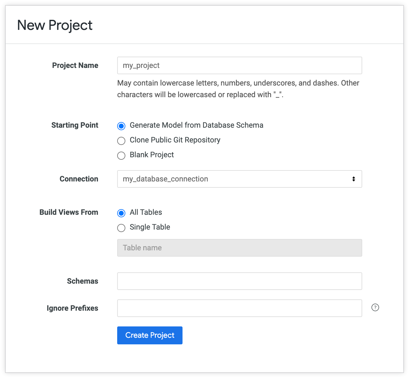 - In the Build Views From section, for this example, we select the All Tables option so that the LookML generator creates a view file for each table in your database.