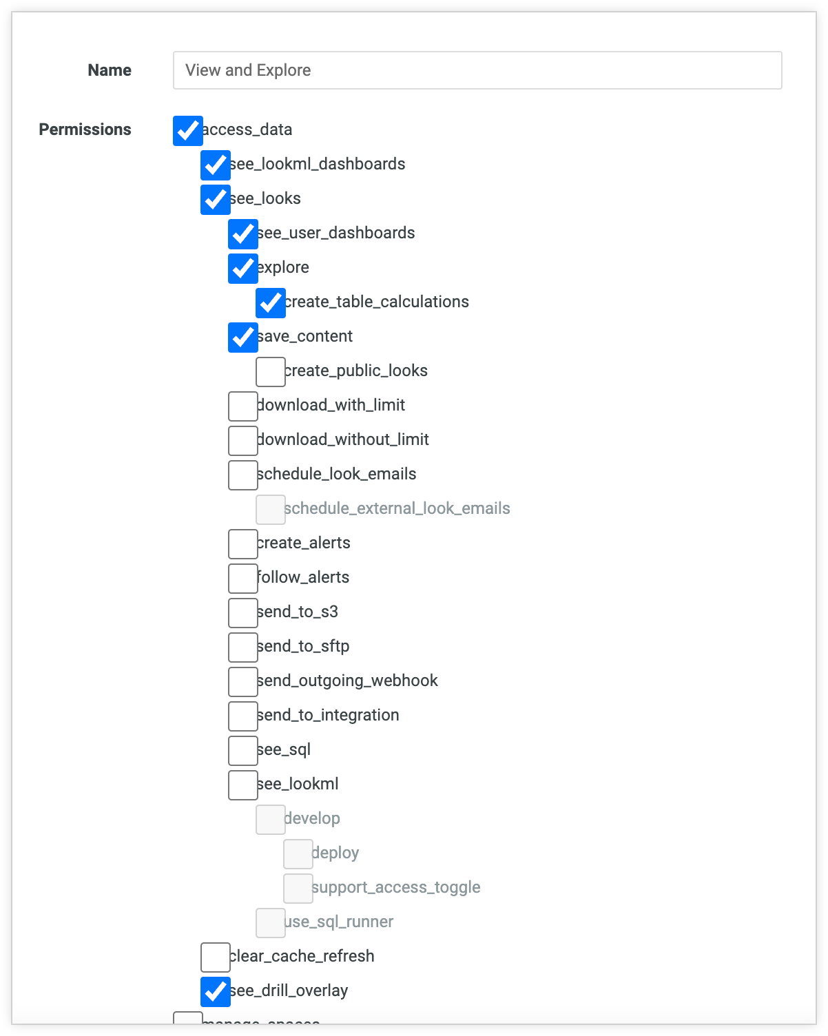 access_data,create_public_looks,download_with_limit,download_without_limit,save_content,schedule_external_look_emails,schedule_look_emails,see_looks,see_schedules,send_outgoing_webhook,send_to_s3, andsend_to_sftppermissions. - View and Explore: The View and Explore permission set includes the