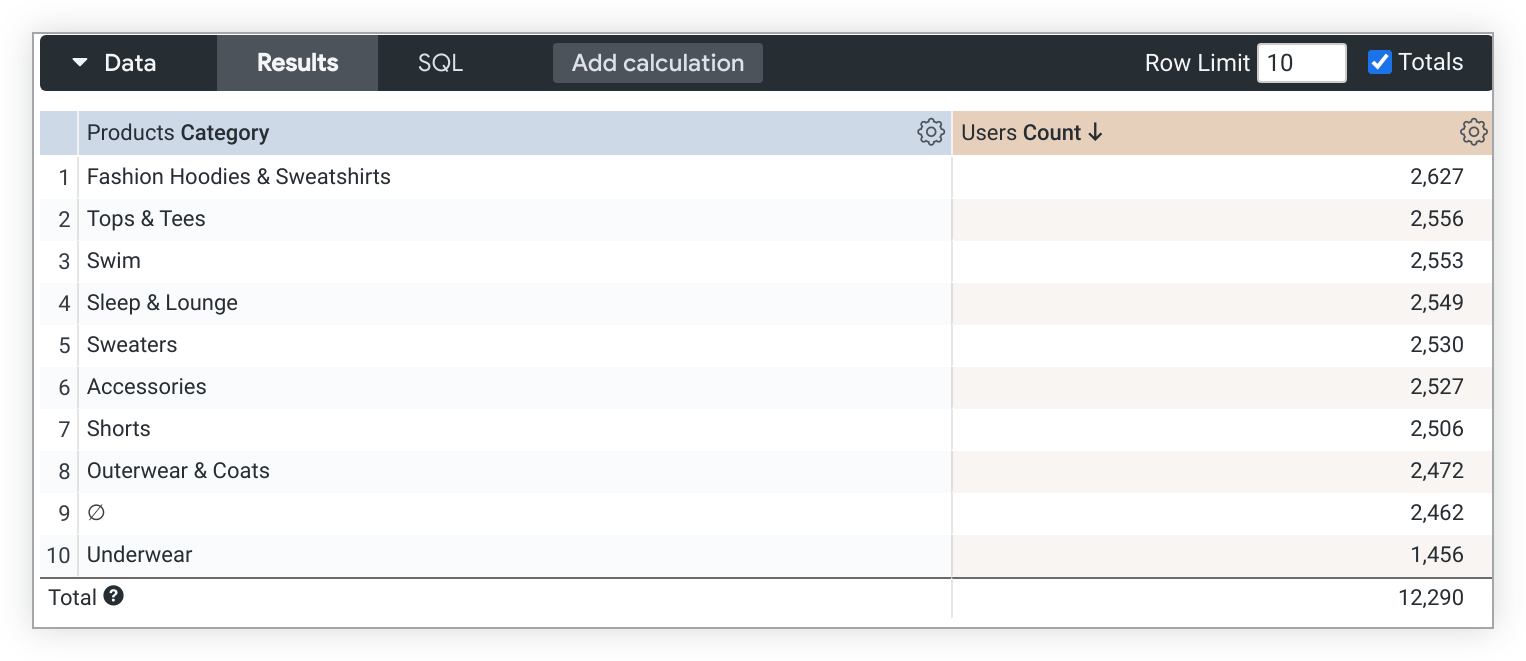 Notice that if you manually add the values in the Users Count column, you get a number that is much higher than the total that is reported by Looker. Because each user can make purchases from multiple categories of products, when you add up each row yourself, you add some users more than once. However, Looker uses a SQL query to calculate the count of distinct users and in this way avoids double-counting.