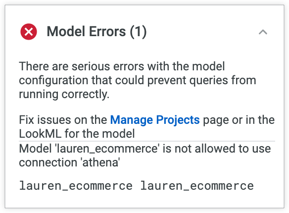 For example, the following error indicates that the model lauren_ecommerce is not allowed to use the athena connection: