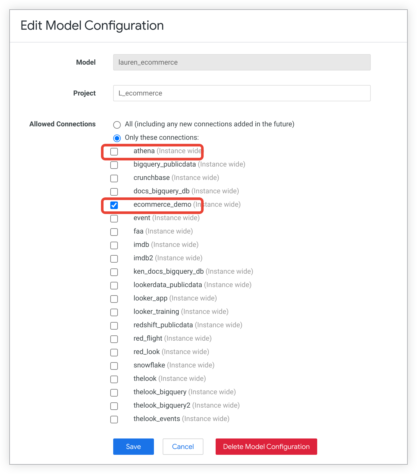 model 'lauren_ecommerce' is not allowed to use connection 'athena'.The connection athena is not selected in the model's Allowed Connections. Theecommerce_democonnection was selected by mistake in this case: