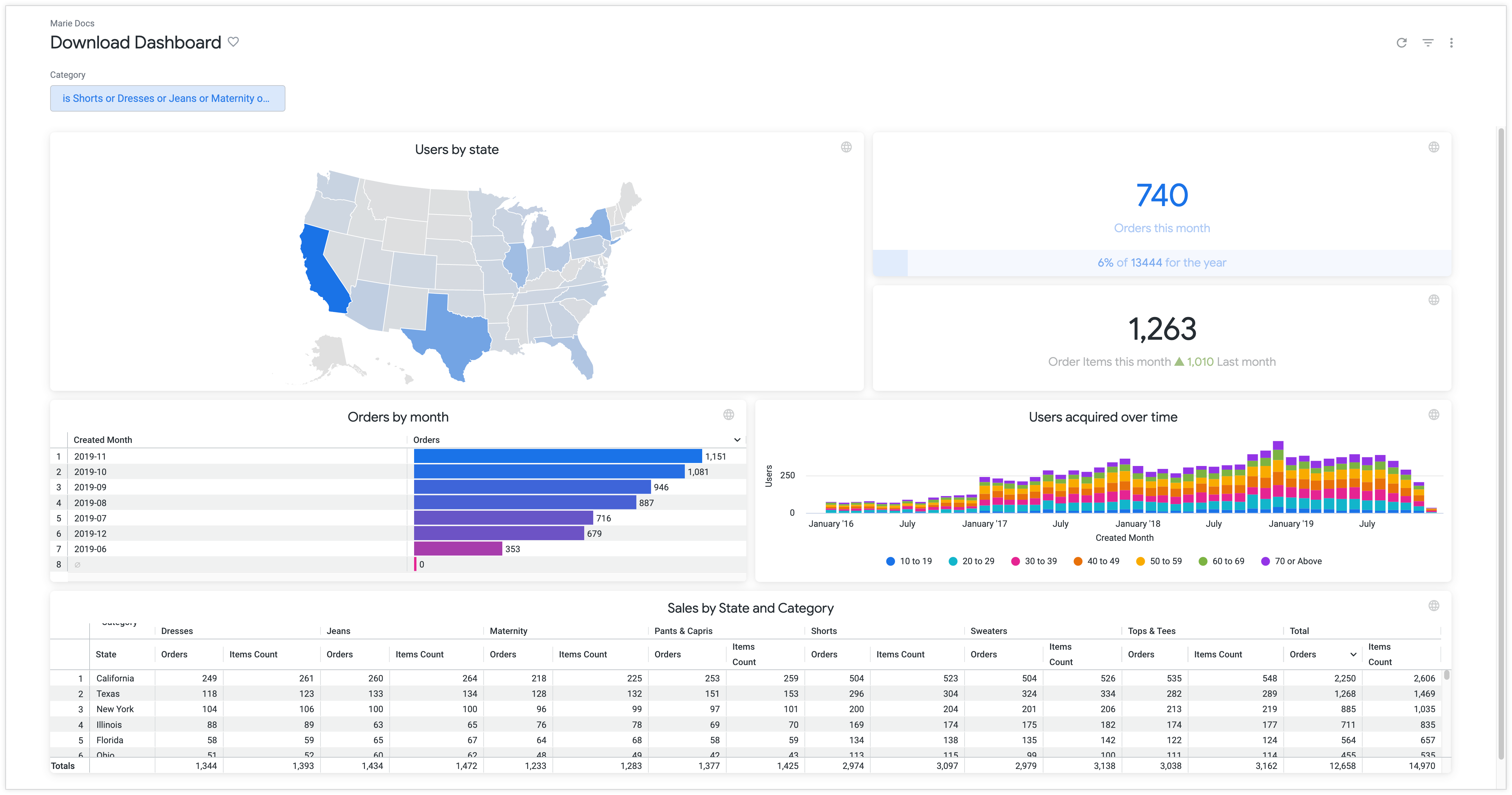 By default, a PDF file mirrors what you see when you view the dashboard in your browser at a width of 1680 pixels. Here is an example of a PDF download with Looker's default settings: