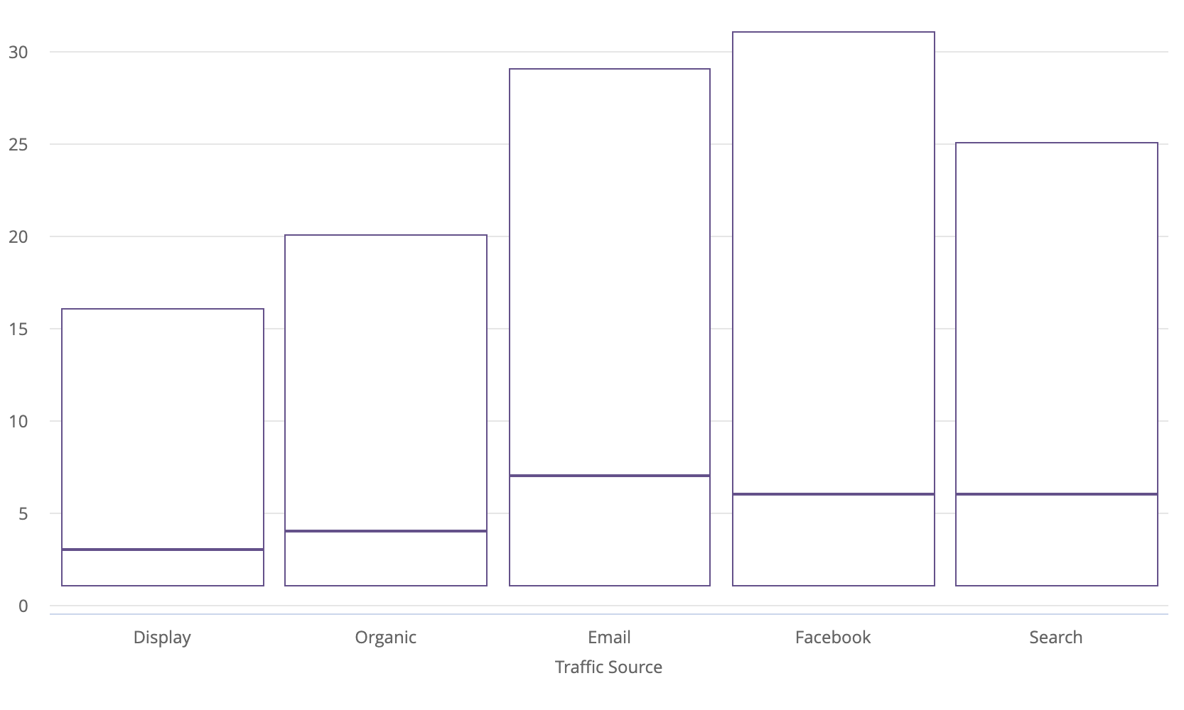 For example, if you create a boxplot chart that is based on the Traffic Source dimension with three measures that represent the minimum, median, and maximum data values for the Lifetime Orders dimension, the visualization will display boxes without the whiskers.