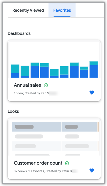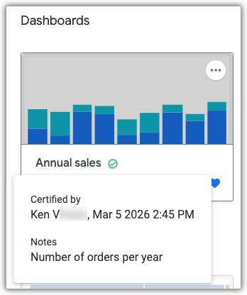 In the details panel for dashboards, LookML dashboards, and Looks, you can view certification metadata, including the certifier's name, the certification date and time, and any notes that were saved by the certifier.