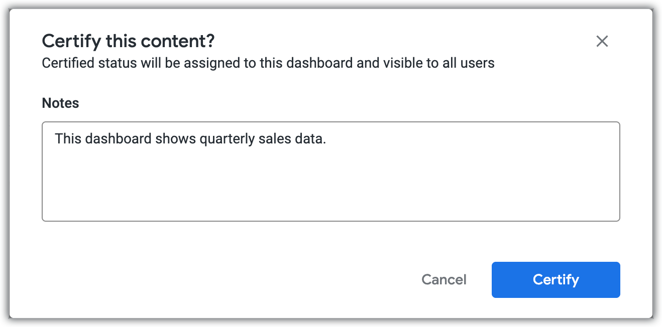 Enter any notes about the content in the Notes field, and click Certify. Notes will be visible when a user hovers over the green certified badge, and from the dashboard, LookML dashboard, and Look details panels.