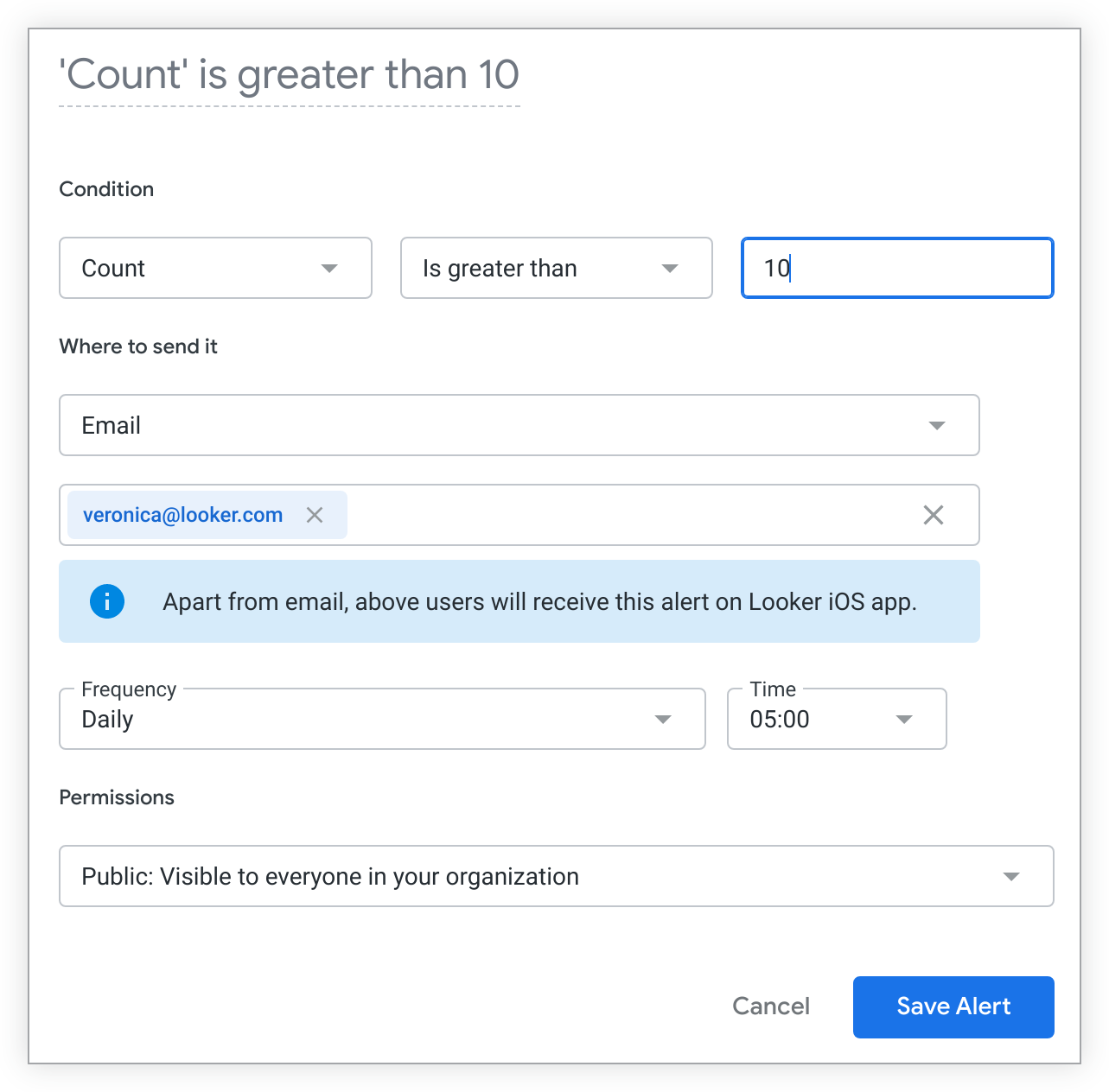 You can set your alert's permissions by selecting the Public or Private options from the Permissions drop-down in the alert creation window. If an alert can be followed, it is marked Public by default, which means that any Looker user with follow permissions on the dashboard tile's underlying content can see your alert and its settings on the alert view window. They can also follow your alert so that they can receive email notifications when your alert's conditions are triggered.