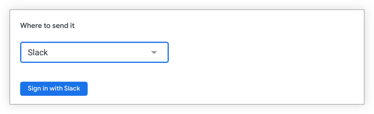 If you have not already authenticated into Slack, a Sign in with Slack button appears under the Where to send it drop-down.