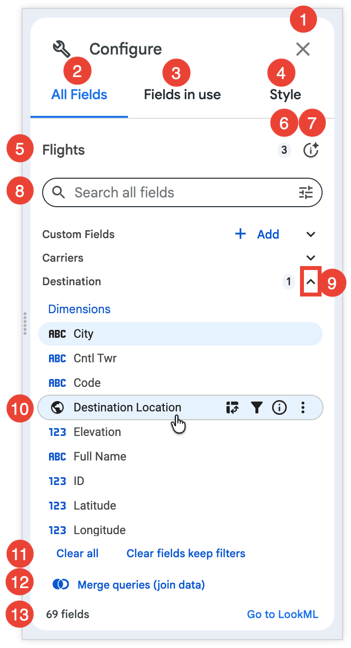 - The Fields in use tab: Displays all the Explore fields that are selected in the query.