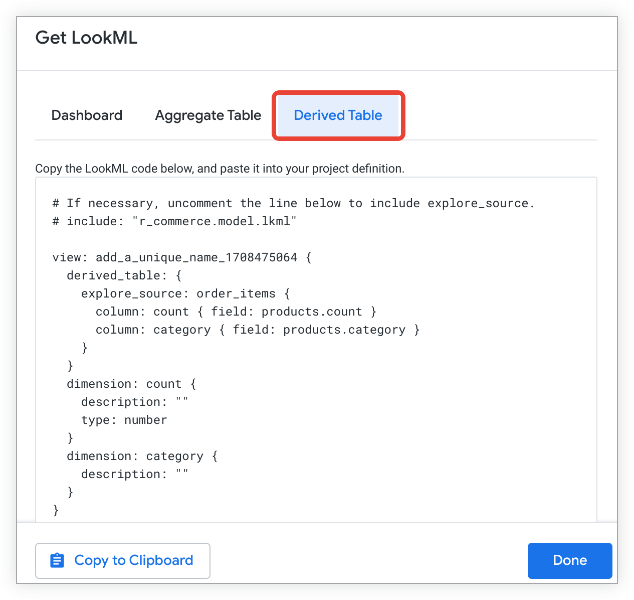 Click the Derived Table tab to see the LookML for creating a native derived table for the Explore.