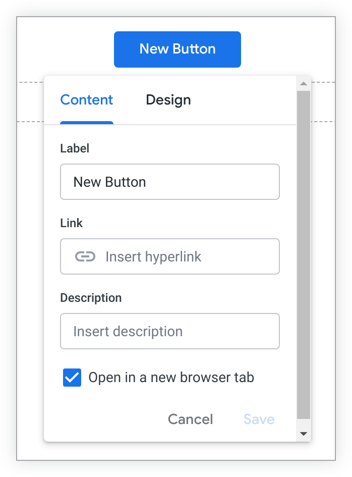 • Description: This description will appear when you hover over the button. If you don't enter a value, the description defaults to the link.