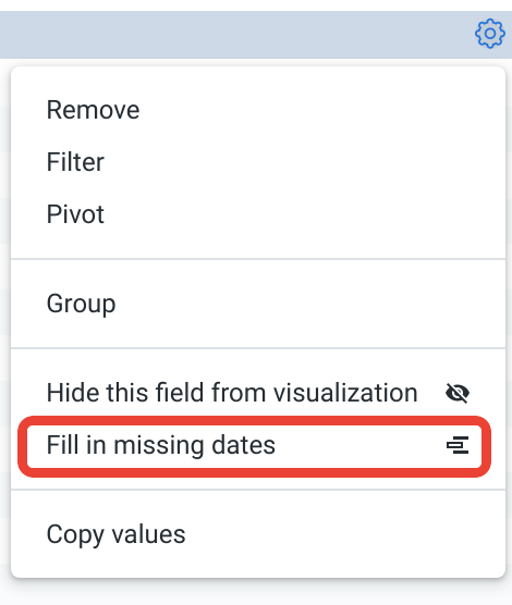 To use dimension fill, select the appropriate dimension's gear menu in the Data section of an Explore. Choose the Fill in Missing Dates or Fill in Missing Values option.