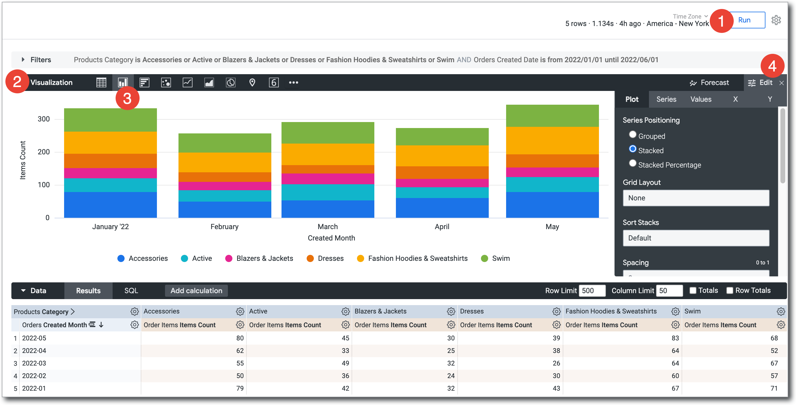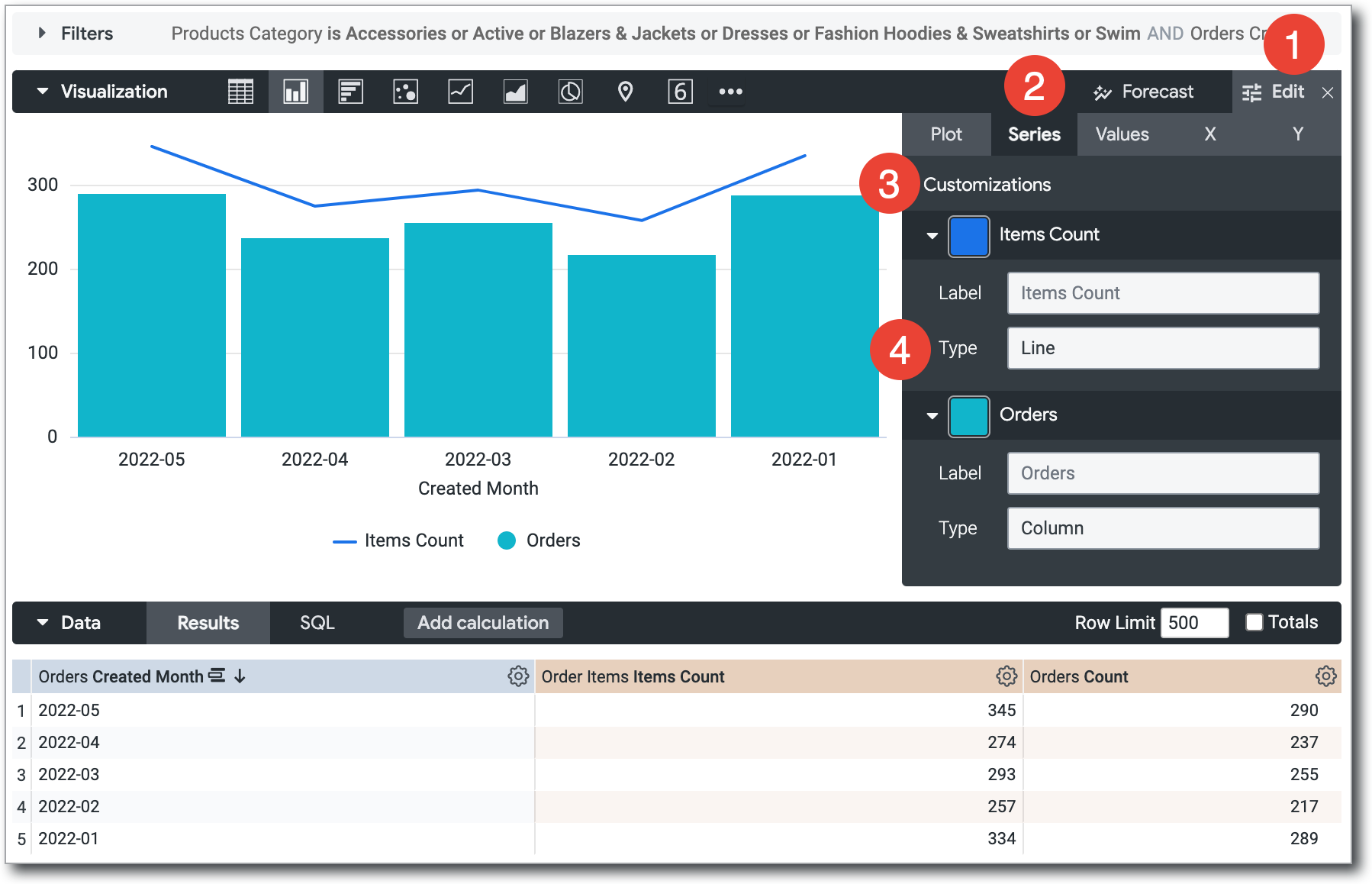 When you're visualizing pivoted Explore results, a single field is split into multiple series. For example, in the visualization that is shown in the Creating stacked charts with multiple visualization types section of this documentation page, the Orders Count field is split into three series: Accessories - Orders Count, Dresses - Orders Count, and Fashion Hoodies & Sweatshirts - Orders Count.