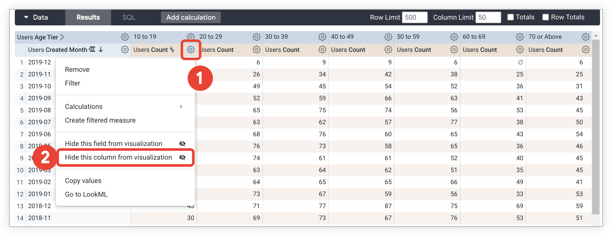 The column gear menu in pivoted results also contains the Hide this field from visualization option, which is described in the Completely hiding a field from the visualization section. When you're applying this option to pivoted results, data is hidden from all columns that are created from that field, not just the individual column that you used to make the selection. In other words, every series made from the parent field is hidden. In the preceding example, all Users Count series would be hidden.