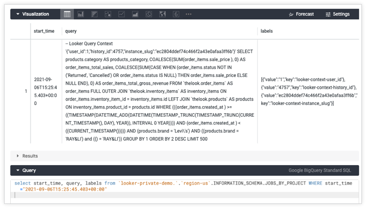 Then Looker would generate the following BigQuery job labels for the same query: