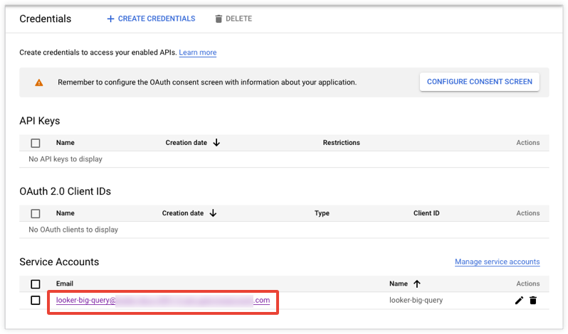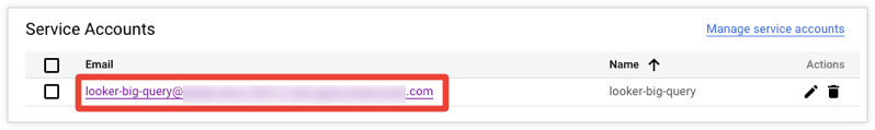 Find the email address that corresponds to the service account. You will need this address to configure the Looker connection to BigQuery: