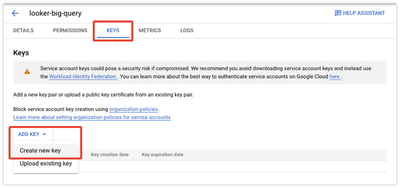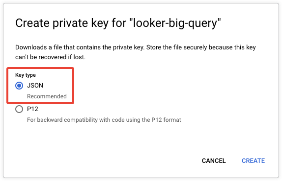 Once you create the service account on your BigQuery database, you will enter this service account information and the certificate file details in the Service Account Email, Service Account JSON/P12 File, and Password fields of Looker's Connections window when you set up the Looker connection to BigQuery.