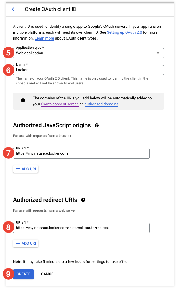 /external_oauth/redirect. For example:https://<instancename>.looker.com/external_oauth/redirectorhttps://looker.<mycompany>.com:9999/external_oauth/redirect.Select Create. Google displays your Client ID and your Client Secret.