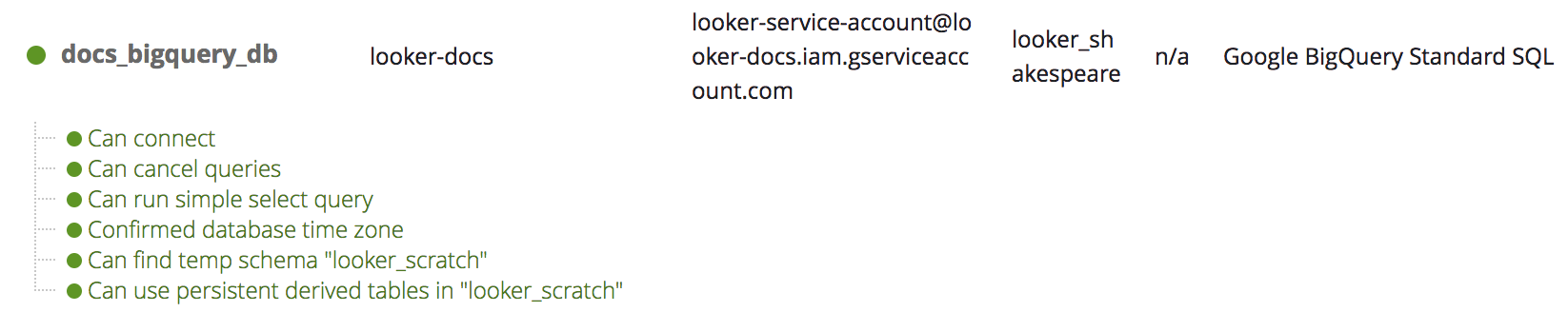 In Looker, test the connection between Looker and your BigQuery database. See the section Testing the connection on this page for the procedure.