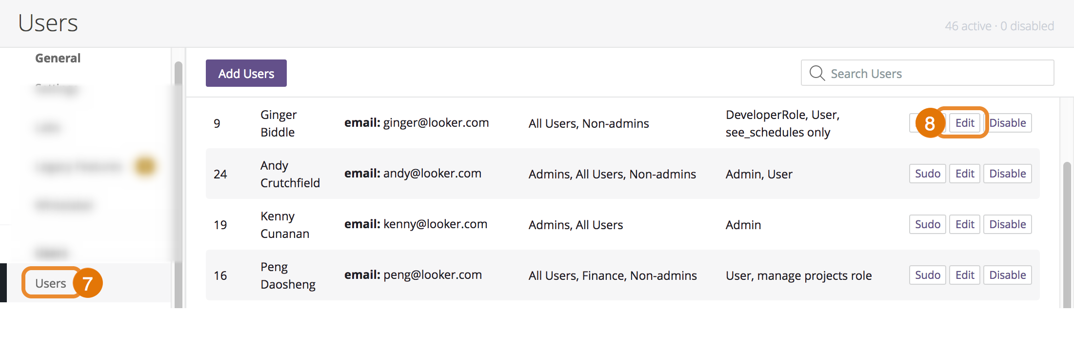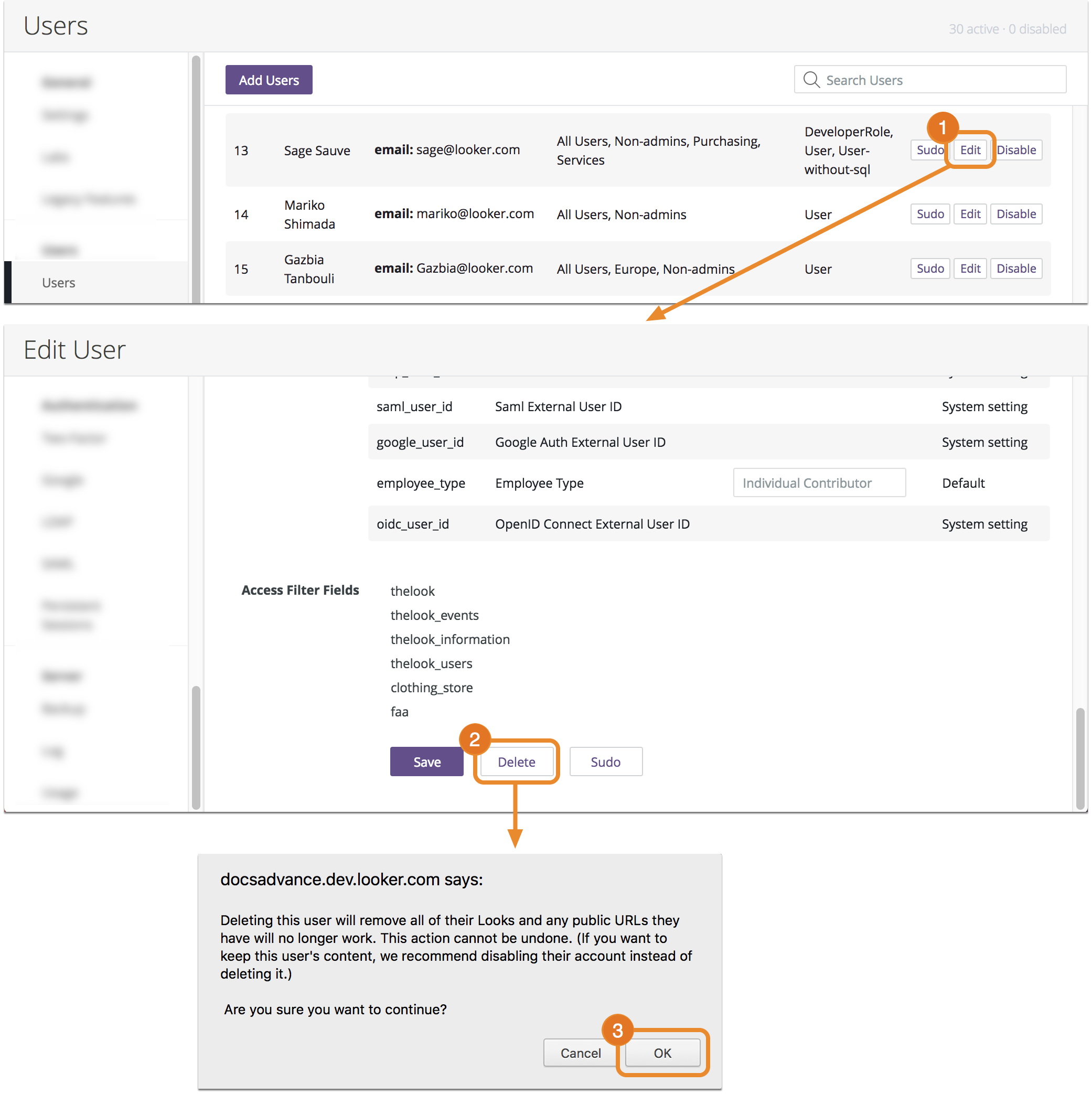 To delete the user, navigate to the Users page in Looker's Admin panel, and then follow these steps: