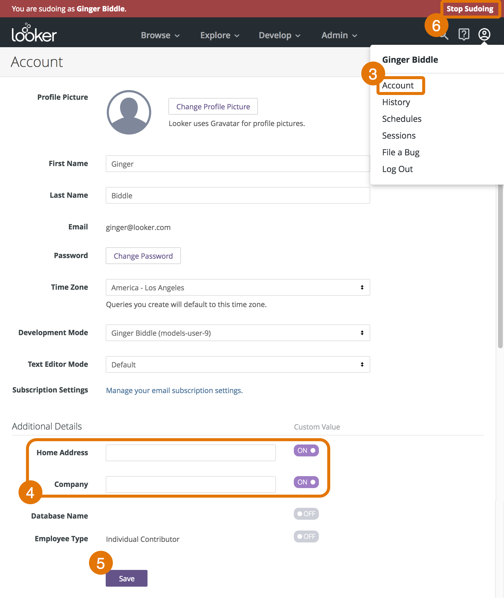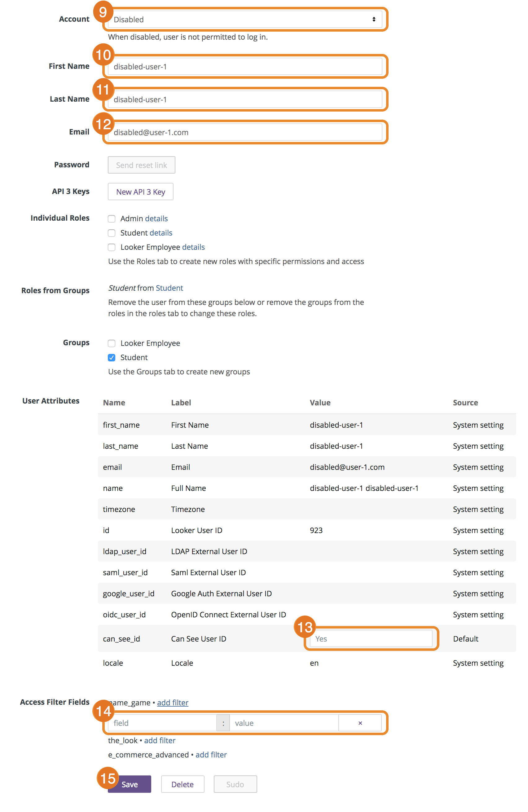 13. Delete or overwrite any User Attributes that contain personal information. If an attribute's source is "System setting" you can't change it directly. Looker will update it as you work through this procedure.