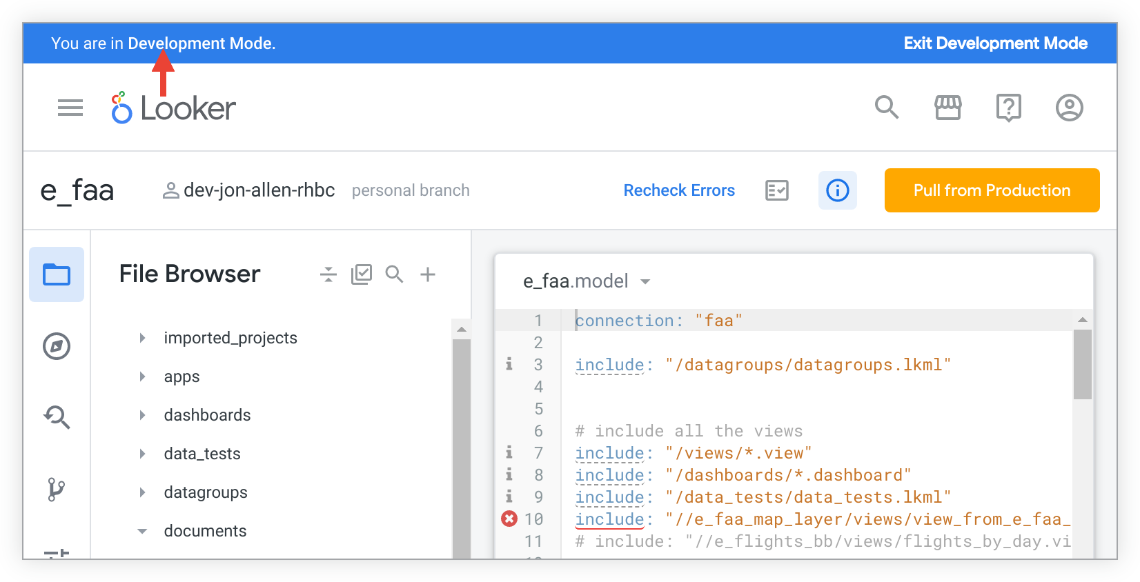 Development Mode lets you make changes to LookML files and preview how they will affect content on your instance. The changes you make to LookML files in Development Mode don't affect the production environment, until they are pushed to the production environment. (If you are familiar with Git, Development Mode uses a separate branch.)