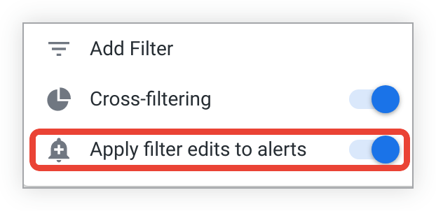 For user-defined dashboards, you can choose whether to sync changes that are made to dashboard filters with all alerts on the dashboard or to sync no dashboard filters changes. You cannot selectively apply changes that are made to dashboard filters to alerts on individual dashboard tiles.