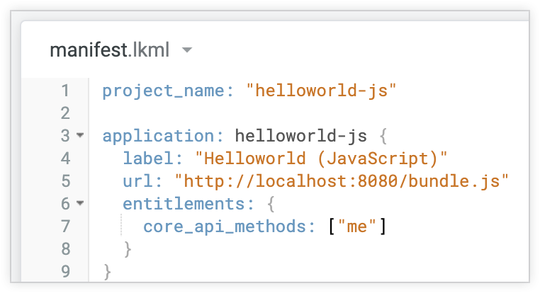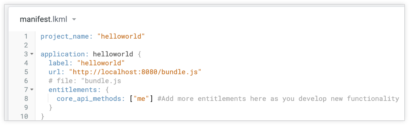 The project manifest file will initally be empty, but later in this procedure you will copy generated contents into your project manifest file that will include the application parameter. The application parameter gives the extension a label, tells Looker where to find the extension JavaScript, and provides a list of entitlements for the extension. Entitlements define the Looker resources that the extension can access. The extension will not be able to access a Looker resource unless that resource is listed in the entitlements.