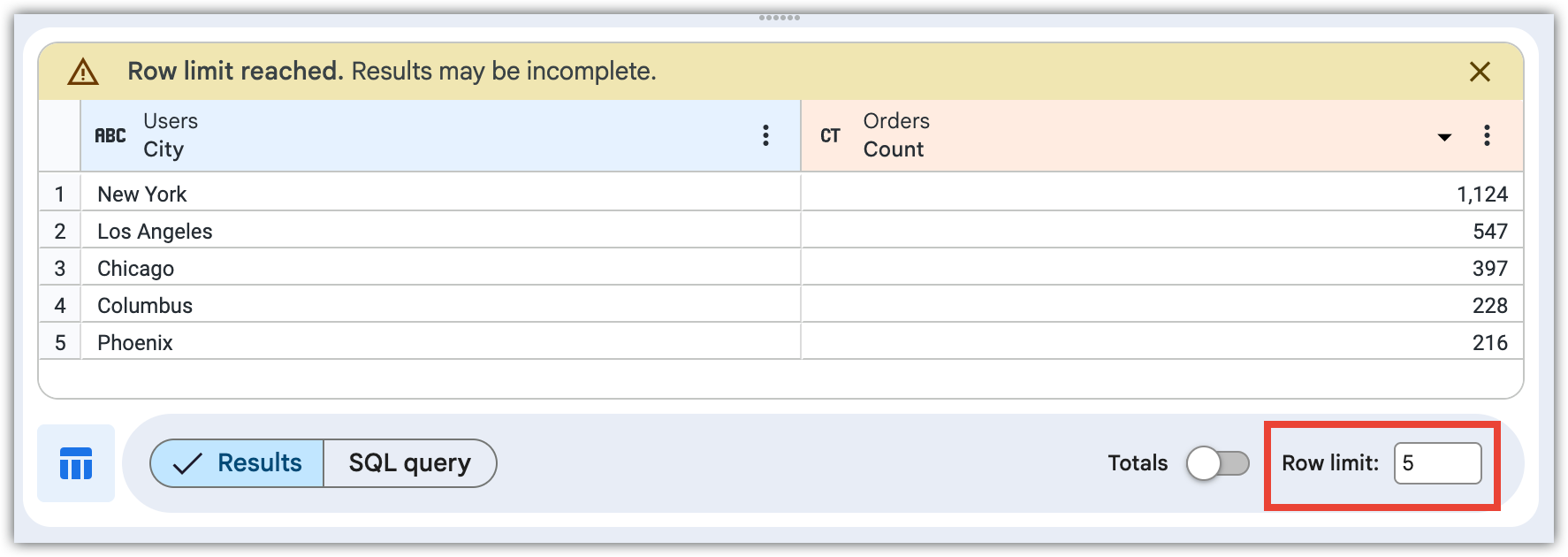 Looker warns you if you might be hiding data by setting a row limit that is too low. The sort order is important: Looker first applies the sort and then applies the limit. For example, in a query that contains the fields Users City and Orders Count, sort by Orders Count and then specify a row limit of 5 to see the cities that had the top five number of orders.
