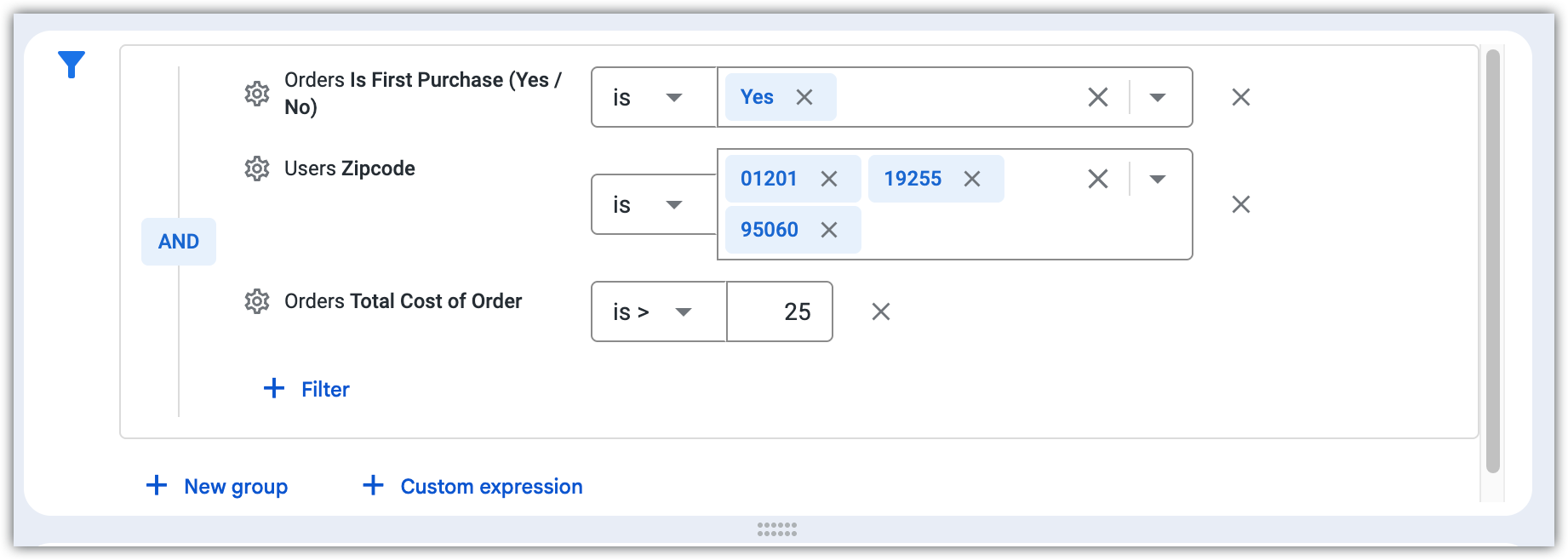 - Add new filters by clicking + Filters, + New Group, or +Custom expression.